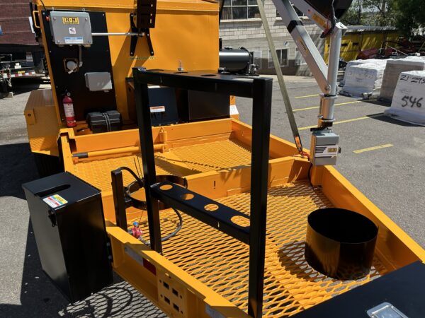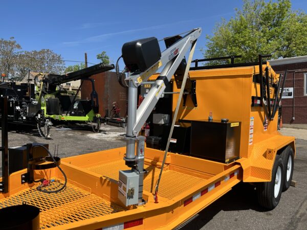 This unit also includes a hydraulic dump hoist, its diesel fired with electric brakes, solvent tank, tool rack and pail holder and rear mounted propane torch with hose reel. It even includes a 12 VDC electric hoist to load and unload the KM 2-18X Infrared Asphalt Heater.