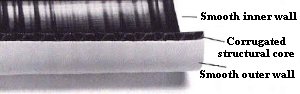 A smooth inner wall is extruded with a corrugated structural core, which is then extrusion-laminated with a smooth white outer wall. This construction gives the pipe an unprecedented strength-to-weight ratio, and stiffness ratings at least double that of any competitive sewer and drain pipe.