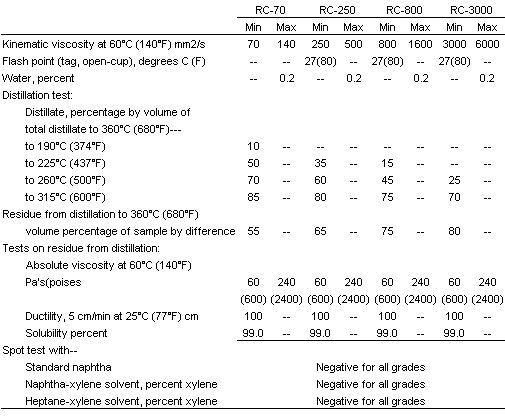 Rapid Cure Asphalt Cutbacks shall as a minimum meet the requirements set forth in AASHTO 81-92, and ASTM 2028-97 as follows: